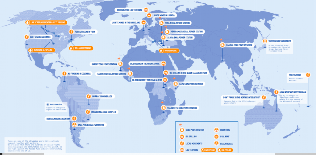 Entretanto, a 350.org divulgou um importante mapa destacando as principais lutas contra combustíveis fósseis hoje no mundo, sendo de destacar as várias existentes na Europa Oriental, nos Estados Unidos-Canadá e em África.